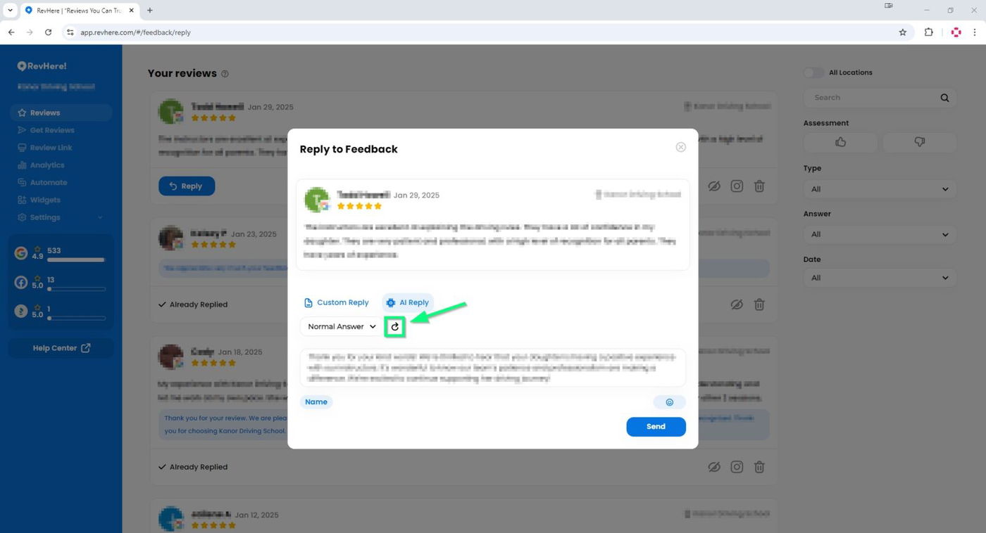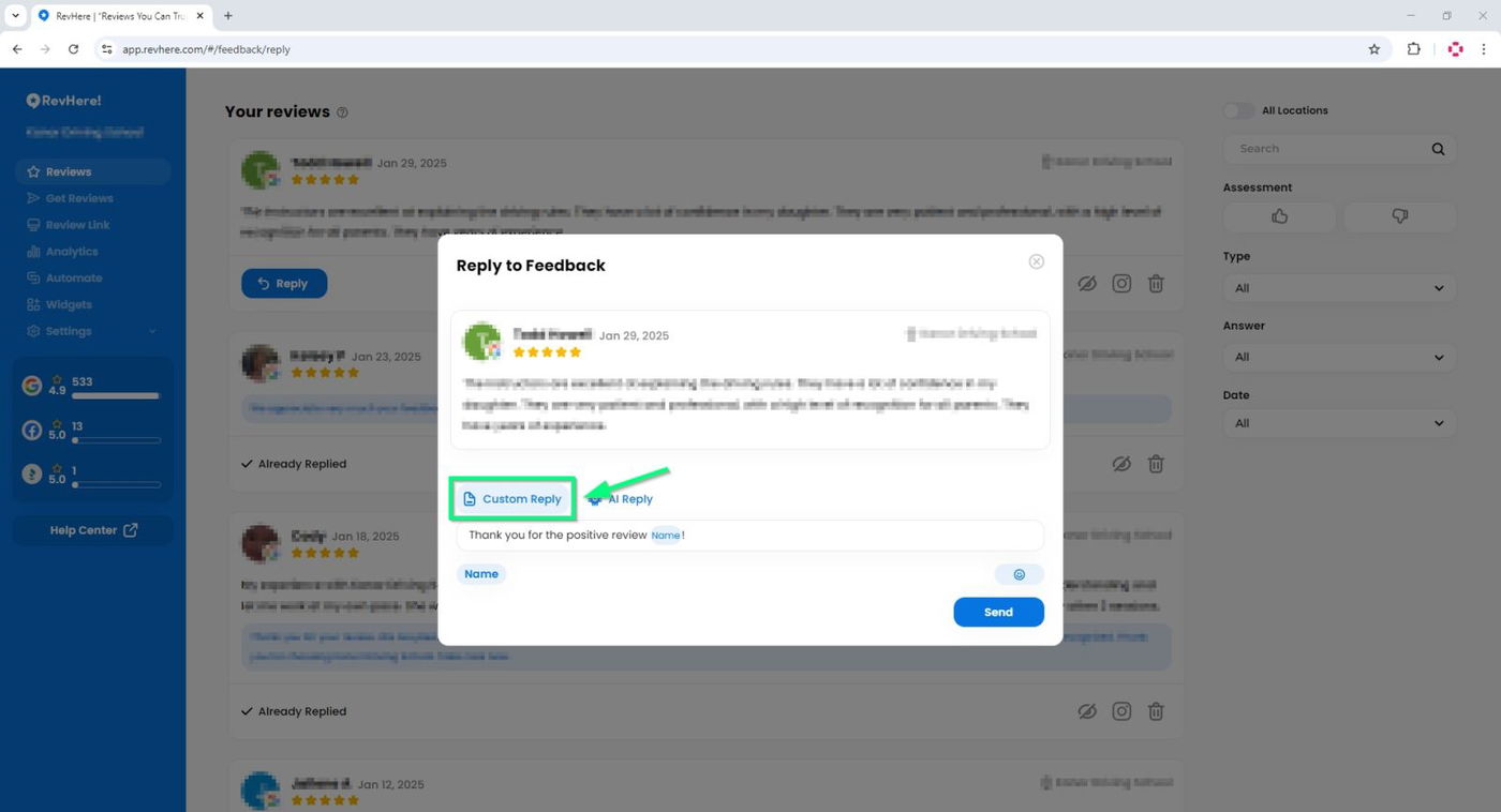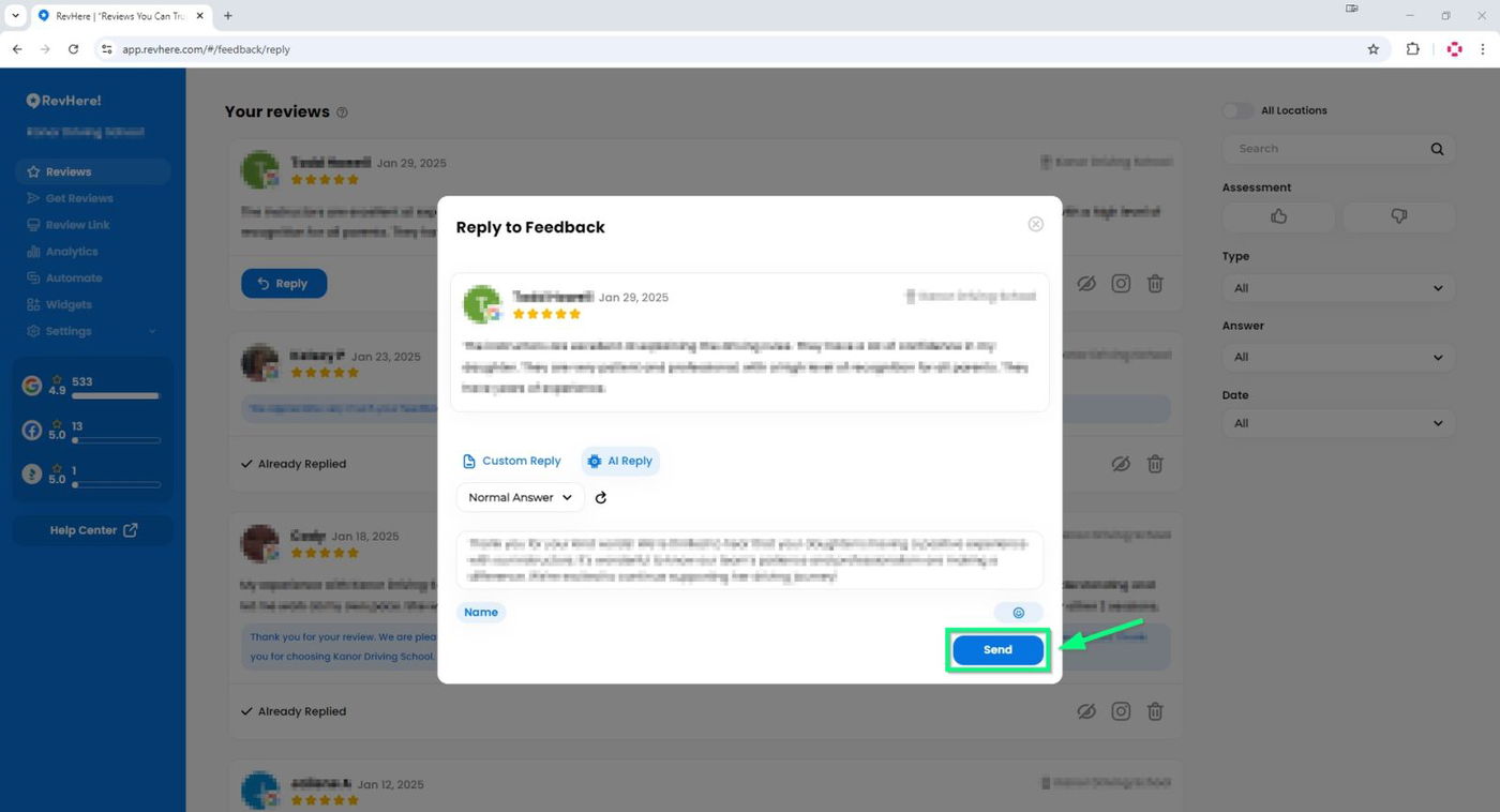 Once you've typed or generated your reply, you can send it by clicking the "Send" button. This will post your response to the review. 🚀