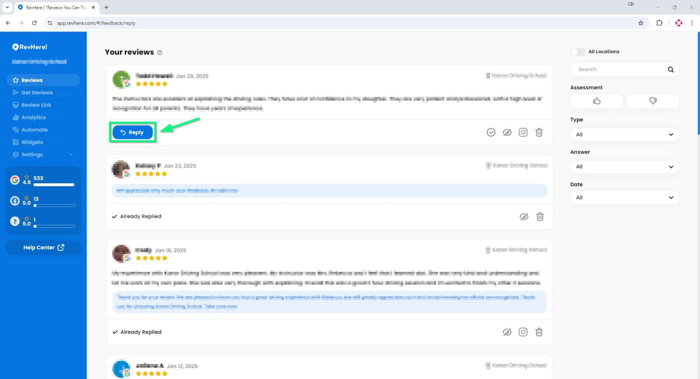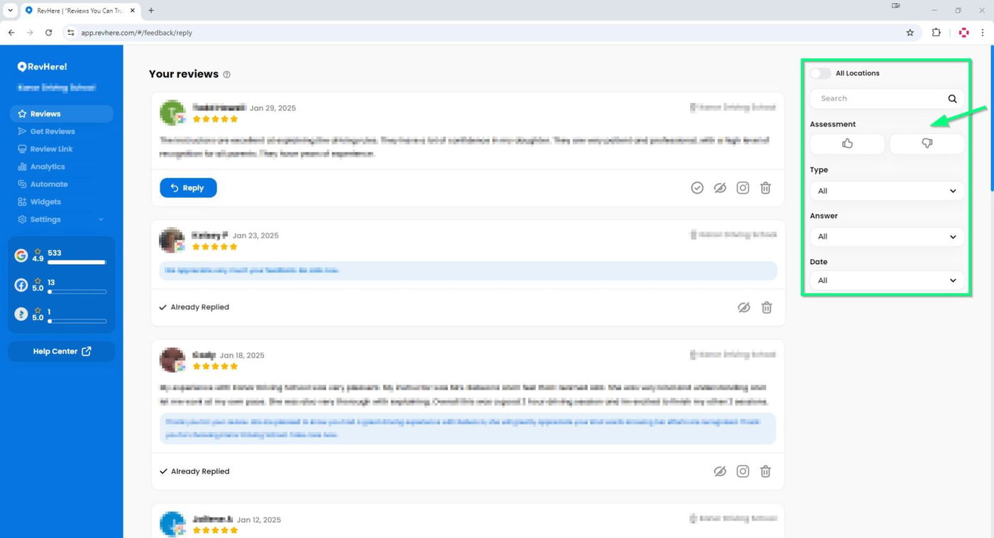 On the right sidebar, you can search for reviews by entering keywords and filter them by Assessment, Type, Answer, and Date.